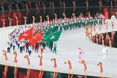 11月9日,第十五届全国运动会开幕式在广东奥林匹克体育中心举行。图为广东省体育代表团、香港特别行政区体育代表团和澳门特别行政区体育代表团在入场仪式上共同入场。 新华社记者 薛宇舸摄