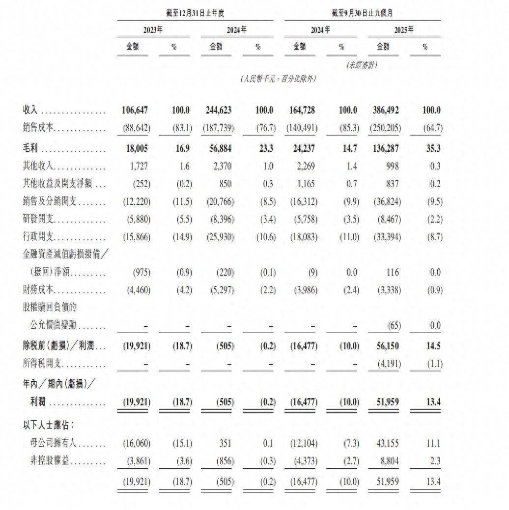 首先,该公司增长依赖规模扩张,盈利能力存在波动。尽管营收在2023年至2025年前九个月实现爆发式增长(年化复合增长率超过100%),但2023年及2024年公司分别录得净亏损,直至2025年前九个月才实现净利润转正。这种“前期亏损、后期盈利”的模式显示公司盈利对规模高度敏感,一旦增速放缓或市场竞争加剧,盈利的可持续性将面临考验。