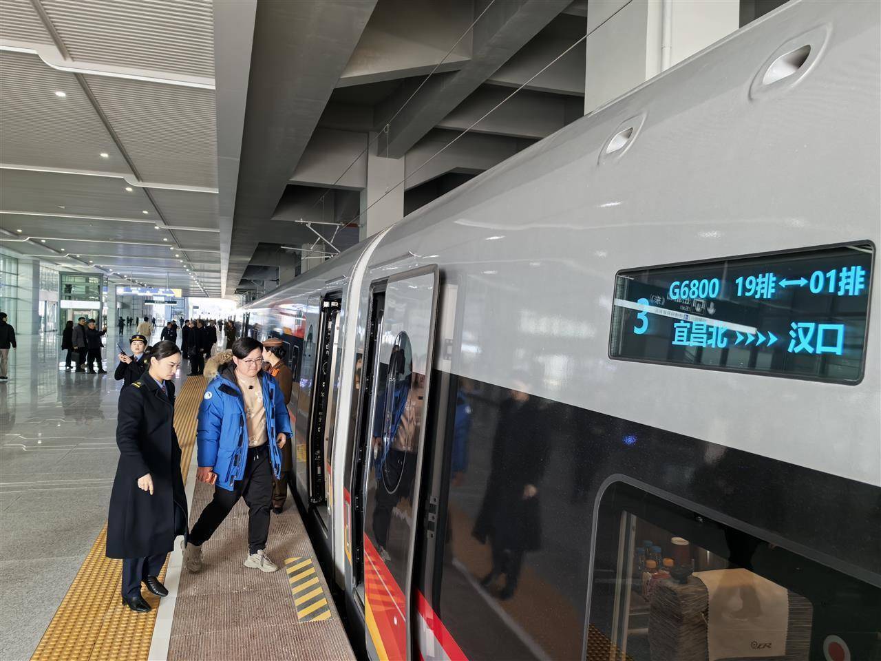 乘客登上沪渝蓉沿江高铁武宜段首发列车