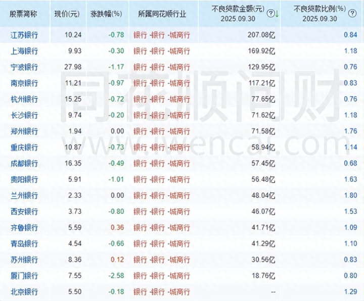 据短平快解读了解,今年前三季度,公司不良贷款进一步上升至207.08亿元,较上年末增加20.23亿元,期末规模在A股17家城商行中排在第一,较第二的上海银行要高上37.16亿元;不良贷款率0.84%,较上年末下滑0.05个百分点,在城商行中排在倒数第七,贷款管理质量较为良好。