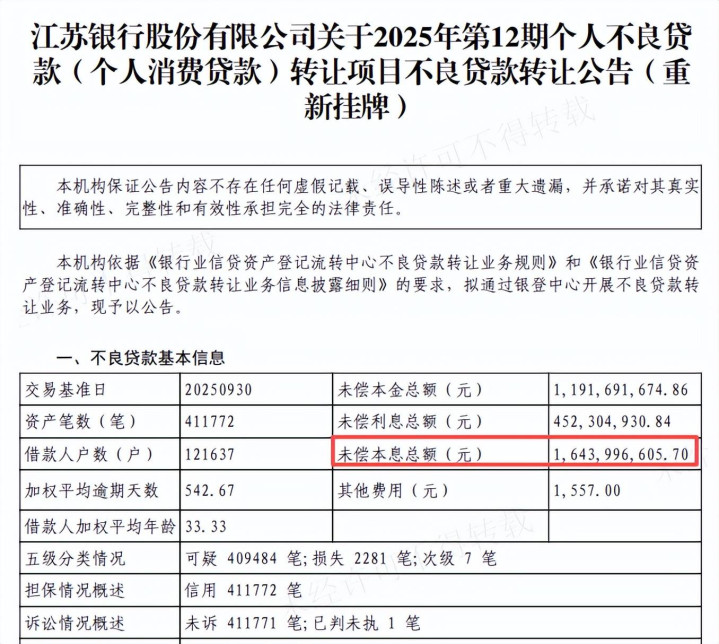 转让超29亿元不良消费贷款。虽然江苏银行没有披露其余个人不良贷款详情,不过公司年内已经多次公告转让相关不良资产,12月9日,公司披露2025年第12期、13期个人不良贷款(个人消费贷款)转让项目不良贷款转让公告。