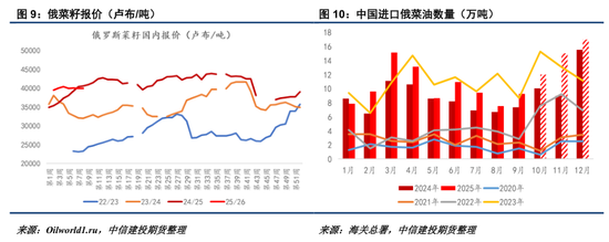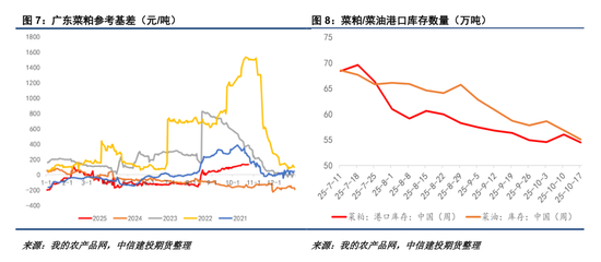 随着俄罗斯新季菜籽收获及压榨上市,近期俄菜油对华报价价格有一定松动,但税后到华东港口成本价可能仍达到9750-9800元/吨。从季节性上看,11月开始中国进口俄菜油数量将达到较高水平,后期华东菜油库存或环比恢复增加。基差角度而言,华南或比华东更有支撑,因俄菜油到港集中在华东,且华南菜籽压榨无法快速恢复。